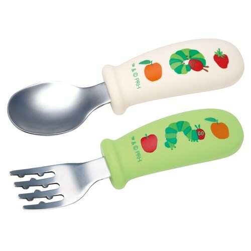 はらぺこあおむしのお子様用スプーンとフォークのセットです。 可愛いキャラクターと一緒ならお食事も楽しくなります。 持ち手は、握りやすくすべりにくい指かけ付きのシリコーン立体グリップです。 |