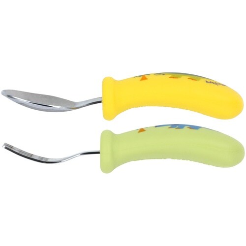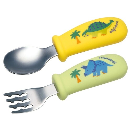 ディノサウルスのお子様用スプーンとフォークのセットです。 可愛いキャラクターと一緒ならお食事も楽しくなります。 持ち手は、握りやすくすべりにくい指かけ付きのシリコーン立体グリップです。 |