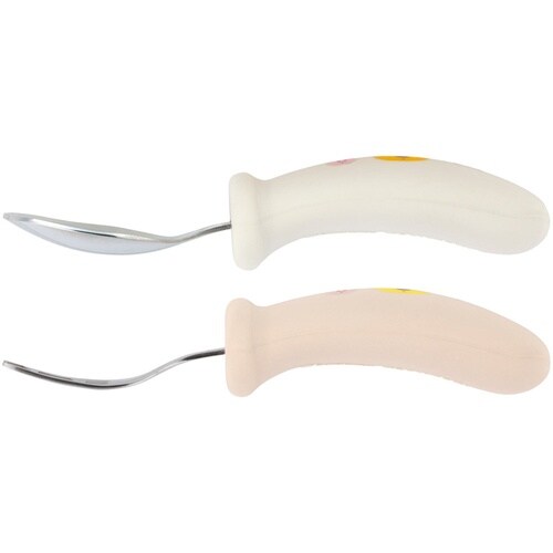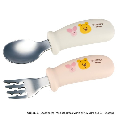 くまのプーさんのお子様用スプーンとフォークのセットです。 可愛いキャラクターと一緒ならお食事も楽しくなります。 持ち手は、握りやすくすべりにくい指かけ付きのシリコーン立体グリップです。 |