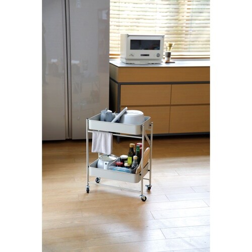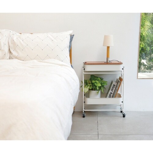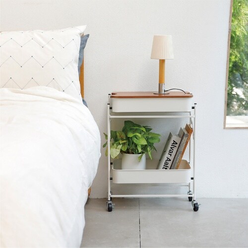 ほぼ組み立ていらずな折りたたみ2段ワゴンです。 キャスター付きなので使いたい場所に持ってくることができます。 寝室やランドリールームでの使用もおすすめです。 目隠しにもなる木目調の天板が付いています。 |