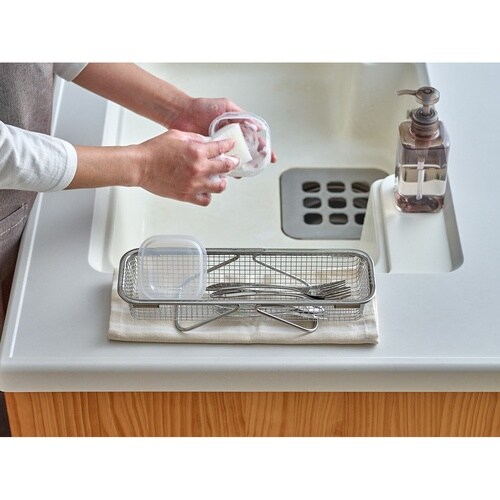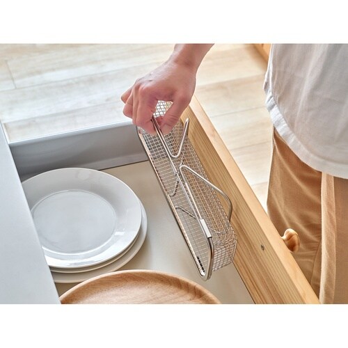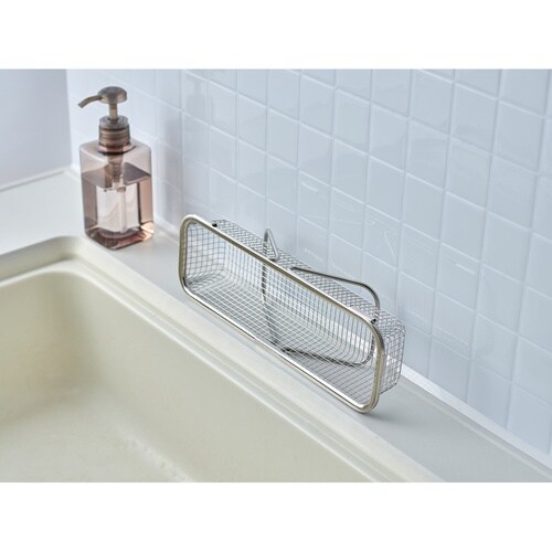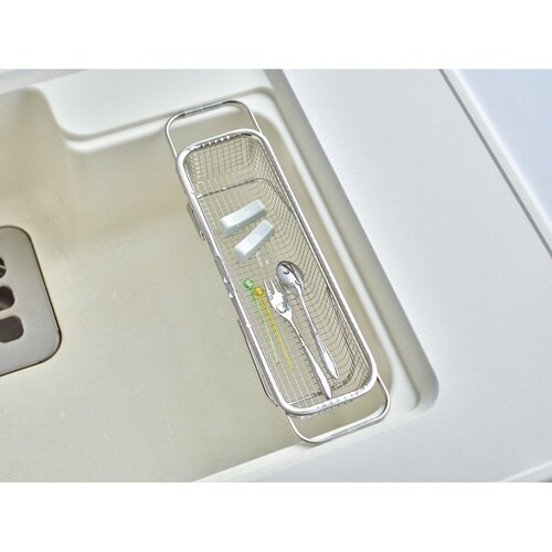 キッチン小物の水切りに最適なのがメッシュタイプの水切りかごのスリムです。 ご家庭のシンクに合わせて伸縮させることができます。 シンクの中だけでなく、天板上でも使用可能です。 |