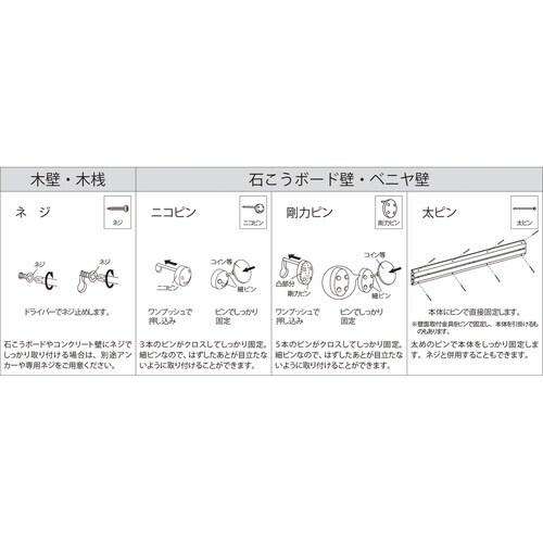 | 注意事項 | ※・取り付け場所:石こうボード壁、ベニヤ壁、木壁、木桟 |