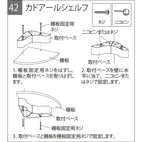 コーナー部分を最大限に活かせる幅22cmのシェルフです。 欲しい角に簡単に設置できます。 ニコピンとネジが付属しています。 |