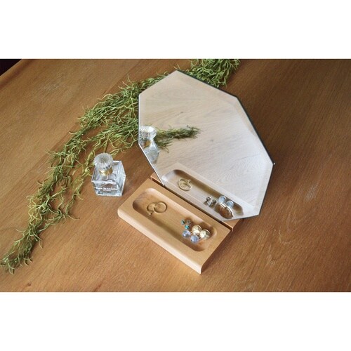 天然木の台座付き卓上&壁掛けミラーです。 天然木を使用したトレー状の台座は、ピアスや指輪などの小物を置くのに便利です。 |