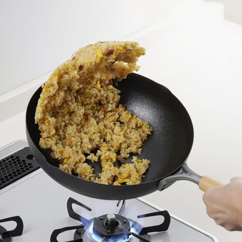 表面に凹凸を付けるファイバーエンボス加工で食材がくっつきにくいです。 鉄は蓄熱性に優れており、食材にムラなく熱が通ります。 深型なので揚げ鍋や茹で鍋としてもお使いいただけます。 |