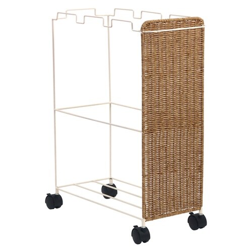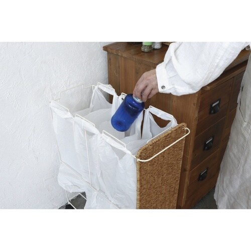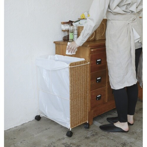 ゴミ袋を掛けるだけの簡単仕様で袋交換もスムーズにでき分別にも便利です。 側面のラタン調デザインがインテリアになじみ、生活感を抑えた空間を演出します。 |
