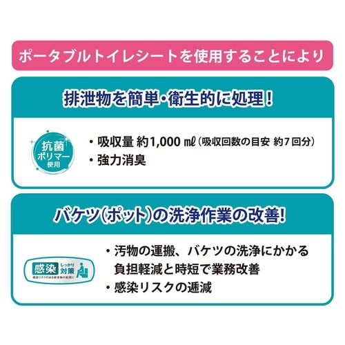 ポータブルトイレにぴったり設置でき、尿や便をしっかりキャッチするポータブルトイレシートです。 使用後はシートごとポイッと捨てるだけなので後片付けも簡単で清潔です。 |