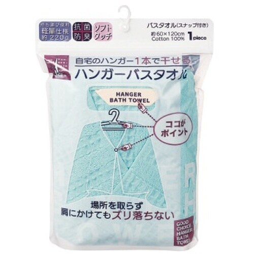 スナップが付いているのでハンガー一本で干せるバスタオルです(ブルー)。バスタオルは干す際に幅をとり苦労しますが、本商品ならハンガーにかけて省スペースで干せます。洗濯を効率的に行いたい方にピッタリ。 |