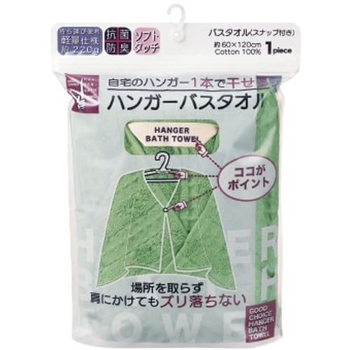 スナップが付いているのでハンガー一本で干せるバスタオルです(グリーン)。バスタオルは干す際に幅をとり苦労しますが、本商品ならハンガーにかけて省スペースで干せます。洗濯を効率的に行いたい方にピッタリ。 |