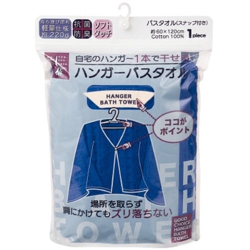 スナップが付いているのでハンガー一本で干せるバスタオルです(ネイビー)。バスタオルは干す際に幅をとり苦労しますが、本商品ならハンガーにかけて省スペースで干せます。洗濯を効率的に行いたい方にピッタリ。 |