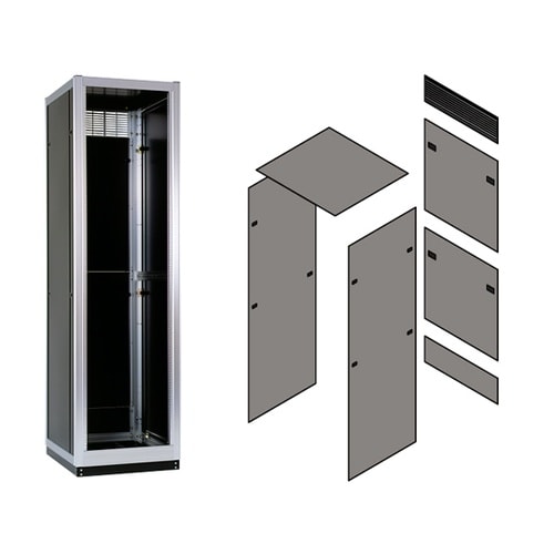 キャビネットラックRKCシリーズの本体枠専用の外装板のセット品です。天板は放熱穴が開いていない仕様になっていますラック後面上部のベンチレーションパネルから自然放熱される構造です。 |