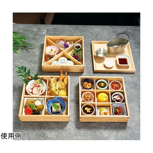 各箱に違った仕切りがついておりますので各箱で違った演出が楽しめます。上部がトレーになっておりますのでお酒や薬味などもセットで提供可能です。 |
