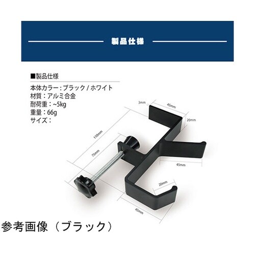 フックが2つ付いているので様々なアイテムを掛けることができます。取付簡単・工具不要、設置の際は本体を板に挟んでハンドルを回すだけ。工具類は何も必要無いので、気軽にお好きな場所に移動、設置が可能です。 |