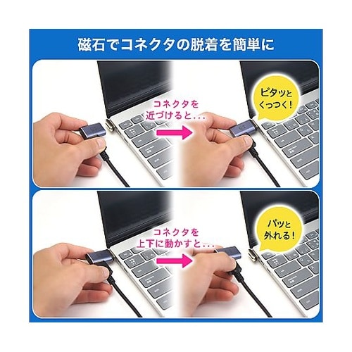 HDMIケーブルと本製品を組み合わせることにより機器とケーブルの脱着を磁石の力でスムーズに行えるようになります。近づけるだけで機器にピタッと取り付けられ、上下にずらすことで簡単にパッと取り外せます。 |