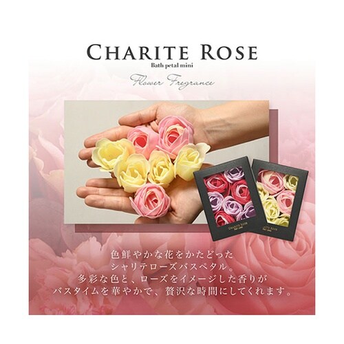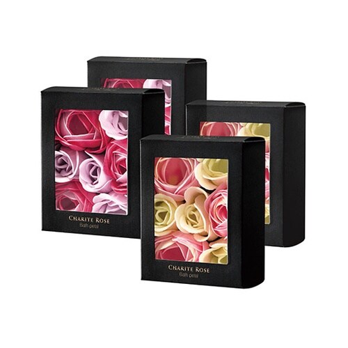 高級感のある黒箱に色鮮やかな花をかたどったバスペタルがつまったギフトにおすすめの入浴剤「シャリテローズ」。プチギフトにおすすめのミニサイズです。 |