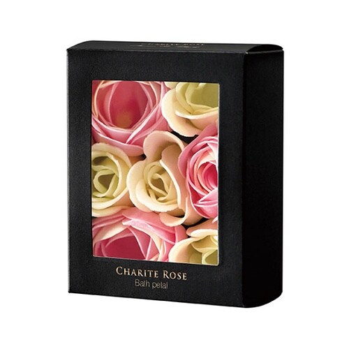 高級感のある黒箱に色鮮やかな花をかたどったバスペタルがつまったギフトにおすすめの入浴剤「シャリテローズ」。プチギフトにおすすめのミニサイズです。 |