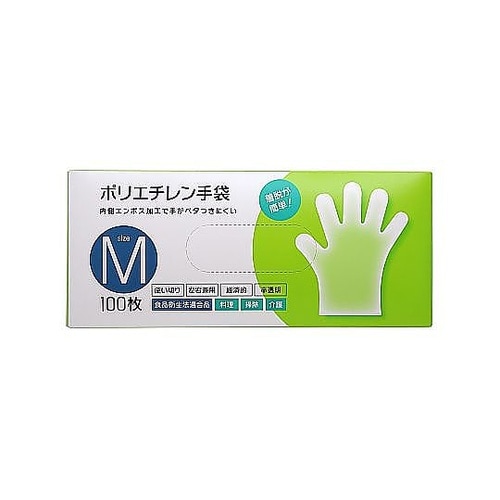 左右両用タイプ(100枚入)の使い捨て手袋です。油や薬品に強いポリエチレン製です。内側のエンボス加工でベタつきにくく、着脱が簡単です。食品衛生法に適合しており、食品加工に使えます。 |