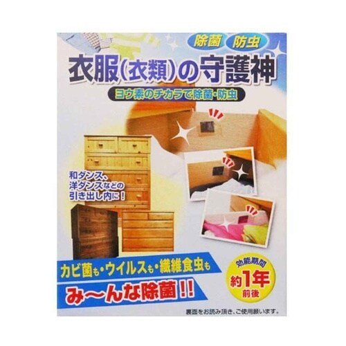 天然素材のヨウ素(ヨード)使用した、衣類用の防虫剤です。クローゼットやタンスの引き出しなどに適しています。両面テープで引き出しの内側などに貼ってお使いいただけます。カビの抑制、繊維虫の予防に。 |