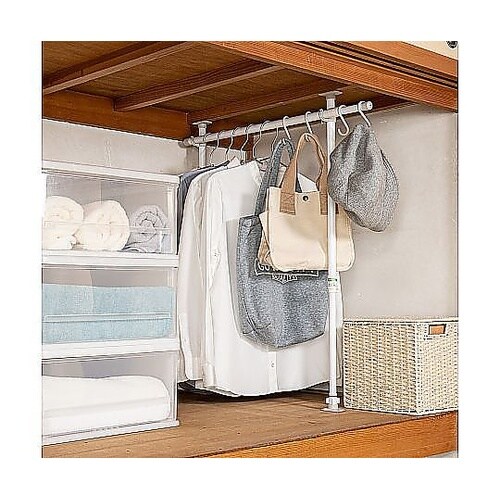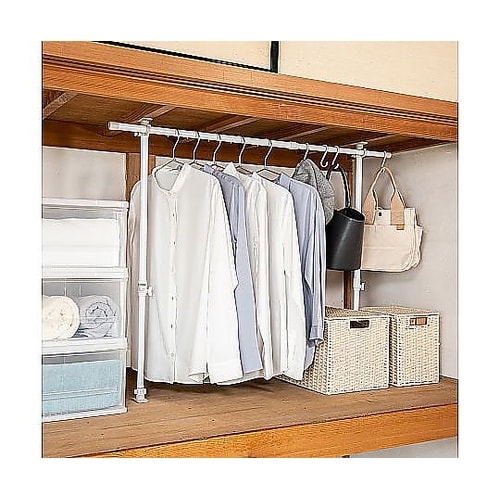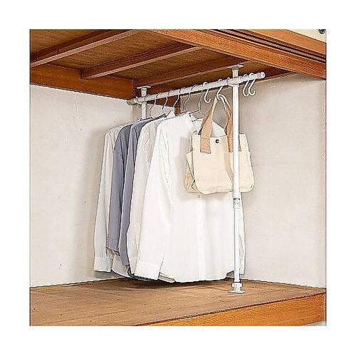 押入れの空間を有効活用できるハンガーポールです。S字フックが4個ついています。安心の耐荷重15kgです。設置場所に合わせて縦、横どちらでも使用可能です。 |