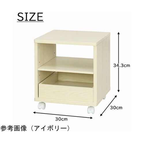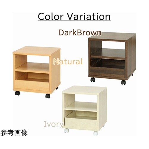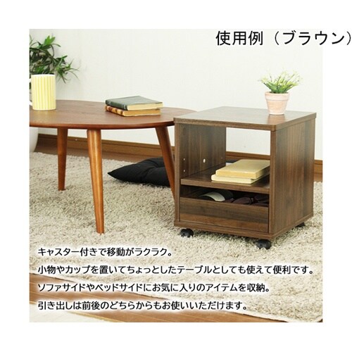 下段の引出しは前後どちらからでも引き出せます。棚板の上に引出しを置いたりアレンジして使用できます。キャスター付きなのでお掃除の際等ははらくらく移動できます。 |