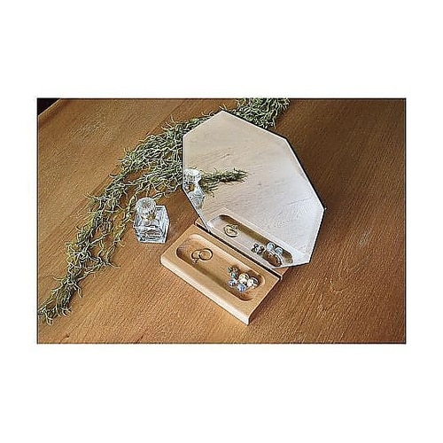 天然木の台座付き卓上&壁掛けミラーです。天然木を使用したトレー状の台座は、ピアスや指輪などの小物を置くのに便利です。 |