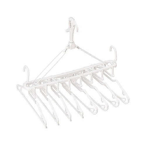 1度に8枚の衣類をまとめて干せる便利な8連ハンガーです。低い位置にある竿にも掛けられるサイドフック付きで、片方に寄せて干しても傾くことなく乾かせます。使わない時は折りたたんでコンパクトに収納できます。 |