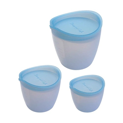 シンプルでオシャレなデザインのシリコンマルチボウルです。ふたつきで、冷蔵庫からそのまま食卓にサーブ出来ます。L・M・Sサイズの3点セットです。注ぎ口が付いているので、液だれしにくいです。 |