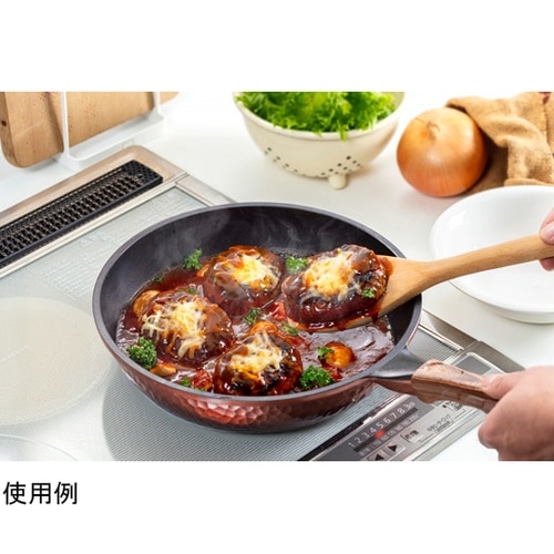 槌目模様と木目調のハンドルの調和が美しい、IH対応のフライパンです。本体表面に打ち込まれた槌目加工で強度もアップ、アルミキャスト(鋳物)製で変形にも強いのが特徴です。 |