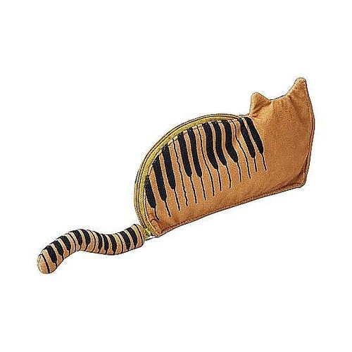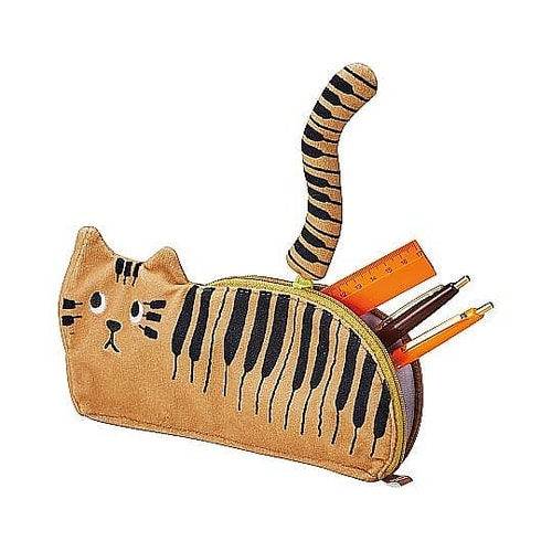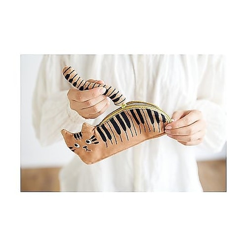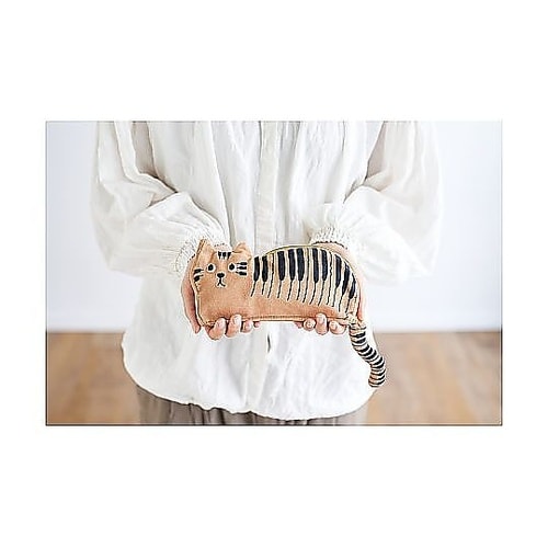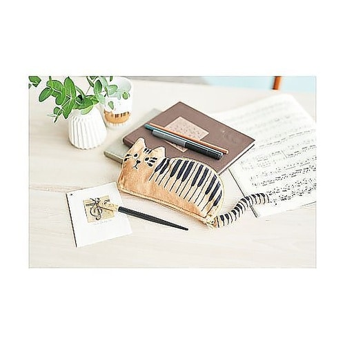ピアノとトラ猫がモチーフのペンポーチです。しっぽがファスナーの引手になっています。開け口が広めなので出し入れしやすいです。文具をしっかり収納できます。 |