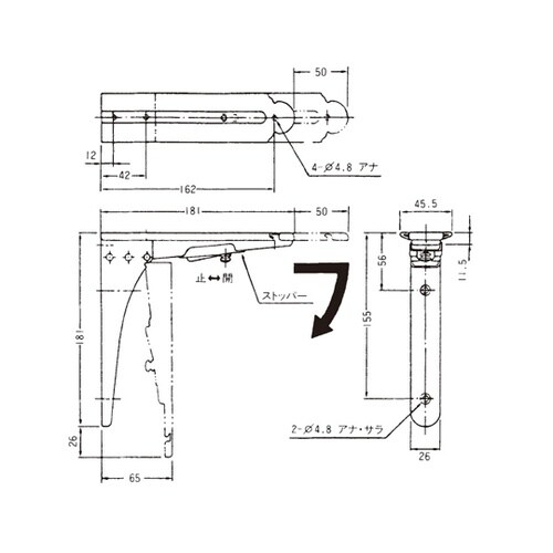 使わないときは折りたためるため、空間を有効に活用できます。不意な折りたたみを防止する安全ストッパー機構付きです。※寸法・容量・重量・形様・強度・仕上り等は多少の変化がある場合があります。 |
