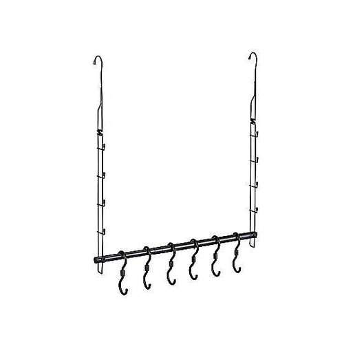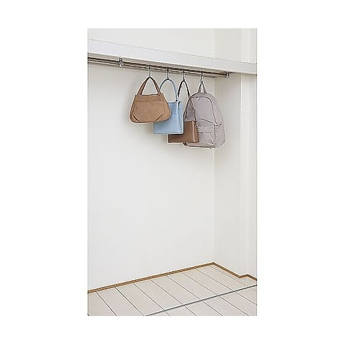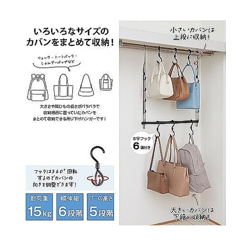 いろんなサイズのかばんをまとめて収納できるハンガーラックです。引っかけるだけで簡単に組み立てられます。収納場所に合わせて幅の調節が可能な伸縮式です。サイドのアームフックに小物も収納できます。 |