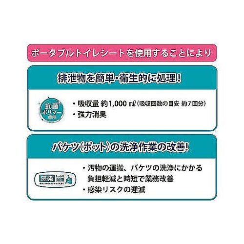 ポータブルトイレにぴったり設置でき、尿や便をしっかりキャッチするポータブルトイレシートです。使用後はシートごとポイッと捨てるだけなので後片付けも簡単で清潔です。 |