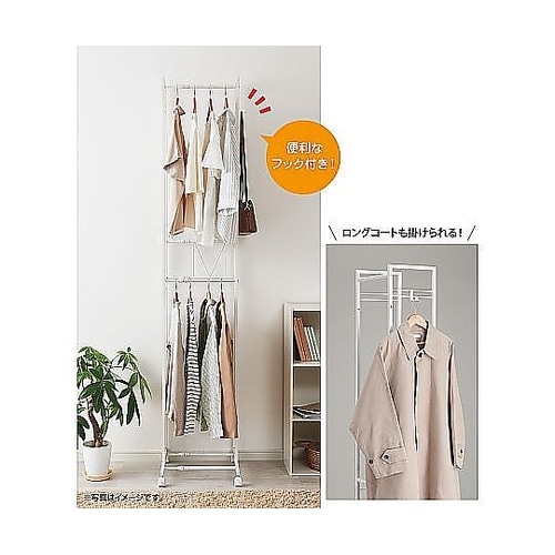 幅を自在に伸縮できるハンガーラックです。上下2段のバーに掛けられるので、たっぷり収納できます。低めの下段は子ども服にぴったりです。洗濯物や乾いた衣類の一時置き場としても便利です。 |