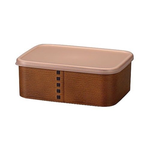 長角型の曲げわっぱ風の保存容器450mLです。割れにくく軽いので、持ち運びにも便利です。小さめのお弁当箱としてもお使いいただけます。フタを外せば、電子レンジ・食洗機対応です。 |