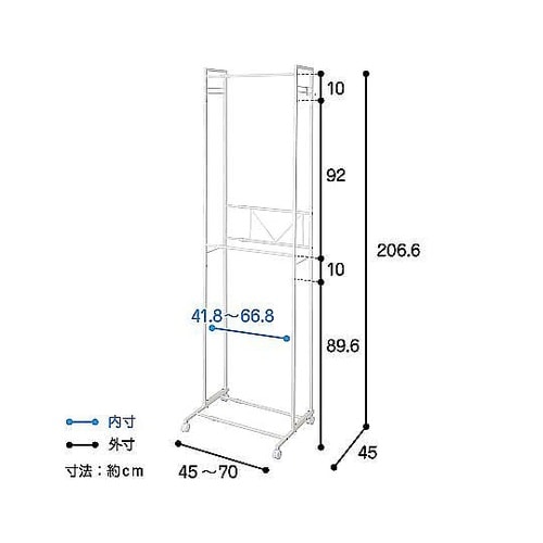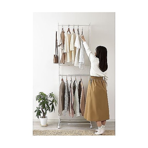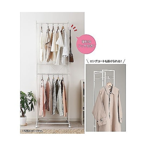 幅を自在に伸縮できるハンガーラックです。上下2段のバーに掛けられるので、たっぷり収納できます。低めの下段は子ども服にぴったりです。洗濯物や乾いた衣類の一時置き場としても便利です。 |