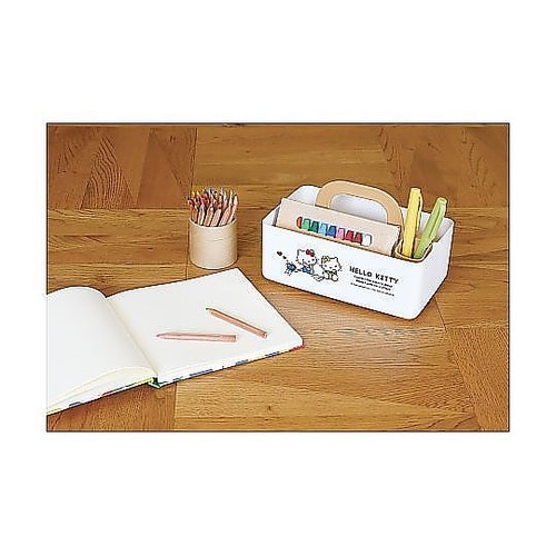 「持って」運べるハンドル付き収納ケースです。B6サイズの手帳や電卓、クレヨンもスッキリ収納可能です。便利なマルチホルダー付きでぺんやブラシを立てられます。限られたスペースにも置けるミニサイズです。 |