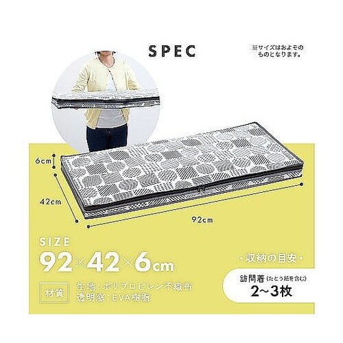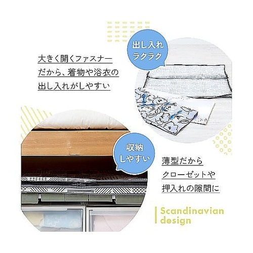 大切な着物や浴衣をホコリから守る収納袋です。大きく開くファスナー付きで出し入れが簡単です。薄型なのですき間収納が可能です。軽量で通気性の良い不織布を使用しています。 |