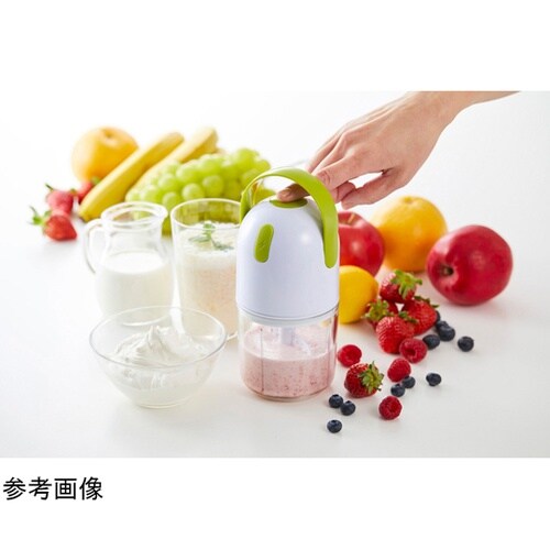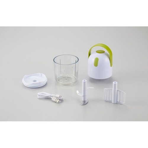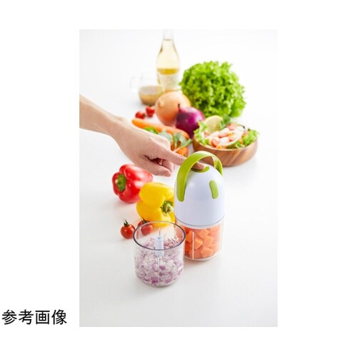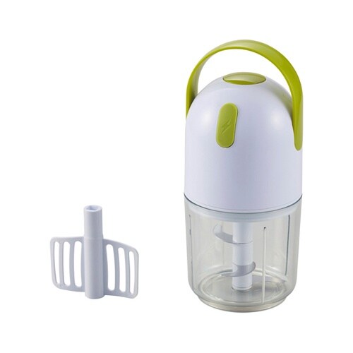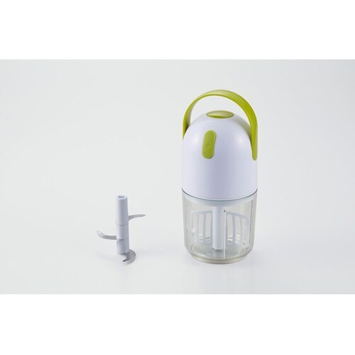 電動式のフードチョッパーです。指1本であっという間にみじん切りができあがります。スイッチを押す時間によって食材の細かさを調節できます。みじん切りとかき混ぜ&泡立て2通りに使えます。 |