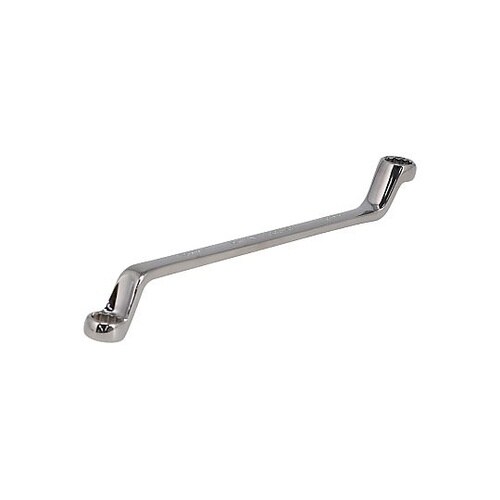 ミラー仕上げのメッキが美しい75°オフセットメガネレンチです。コンパクトなデザインで、狭い場所での作業に適しています。手前の障害物を越えて作業する場面で威力を発揮します。 |