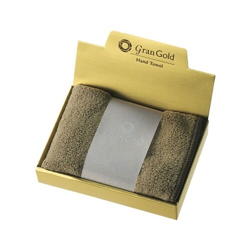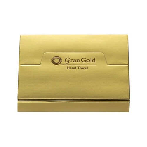 目を惹く輝きのゴールド箱入り、手触り良く吸水性ある大き目ハンドタオルです。 |