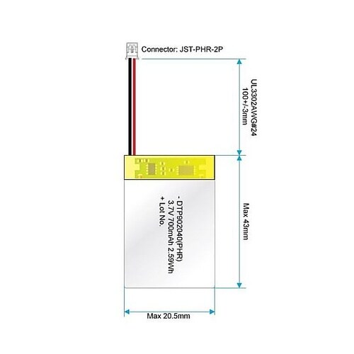 リチウムイオンポリマー電池(3.7V 700mAh) DTP902040(PHR)