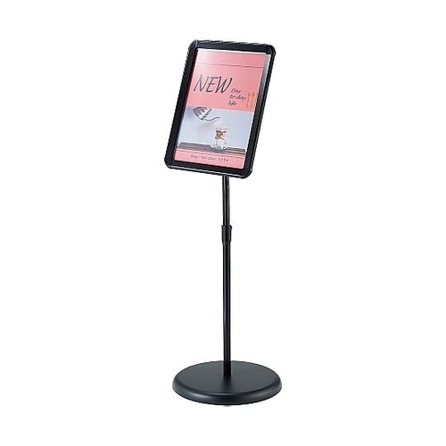 機能性の高いメディアスタンドです。フロントオープンパネルは、前面からフレーム4辺を開閉できるので、後ろに回らずにポスターやポップの差し替えが簡単にできます。タテ・ヨコも付け替え可能です。角度調節可能。 |