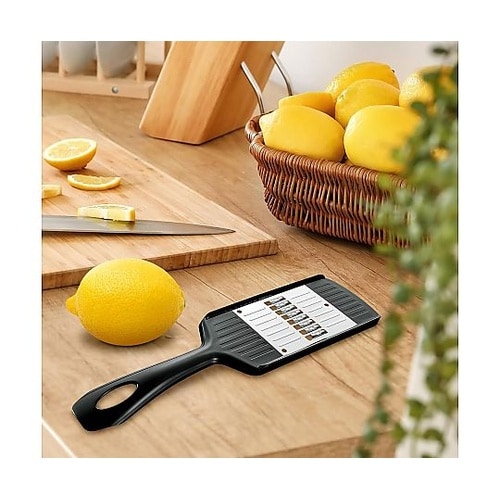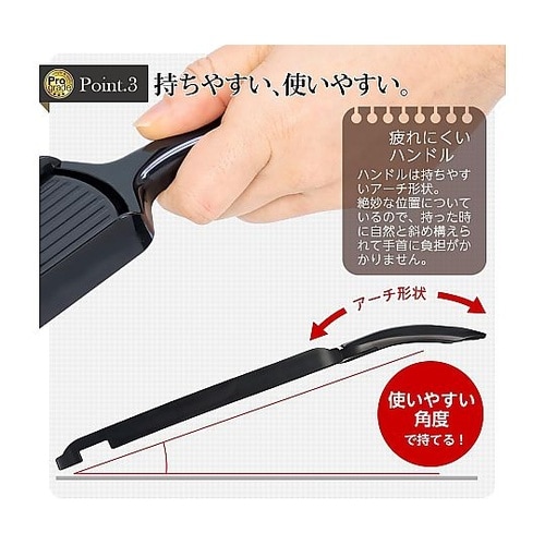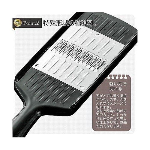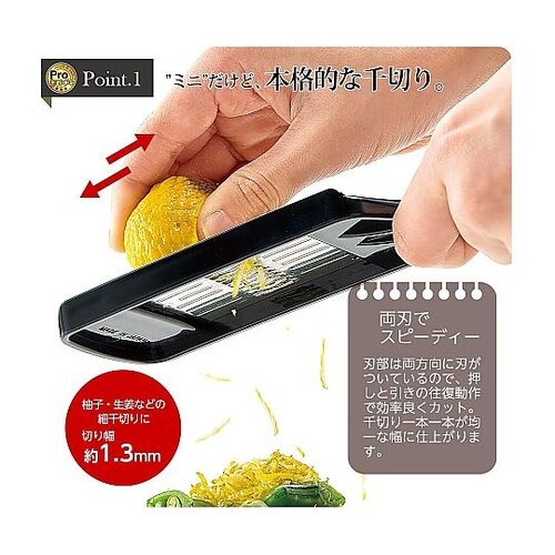 ゆず、ショウガの細千切りをする際に向いています。軽い力で本格薬味千切りができます。切れ味の良い極薄の両刃です。サッと使えるコンパクトサイズです。持ちやすいハンドル角度です。軽い力で往復調理できます。 |