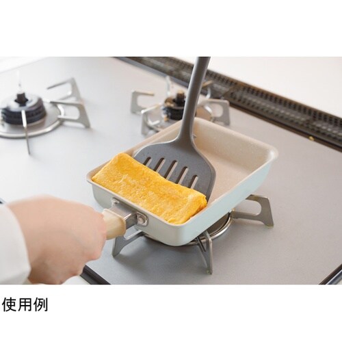 フライパンの内面樹脂を傷つけにくい、やさしい使い心地のキッチンツール。やわらかなシリコーン素材は、UV加工を施し、ホコリがつきにくい嬉しい設計。置いた時に先端が接地しないので衛生的に使用できます。 |