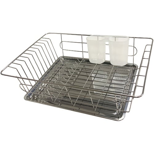 食器類の水切りにご利用いただく水切りバスケットです。サイドのワイヤーが溝状になっており、皿をぐらつくことなくしっかりと立てておけます。箸立てが付属しているので、カトラリー類もきちんと水切りできます。 |