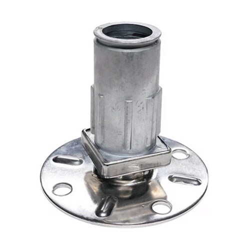ゴムハンマーなどで角パイプに打ち込んで取付けます。アジャスター(中子)を回すことで高さの調整ができます。設置面はアンカー固定用の穴明きフランジです。 |