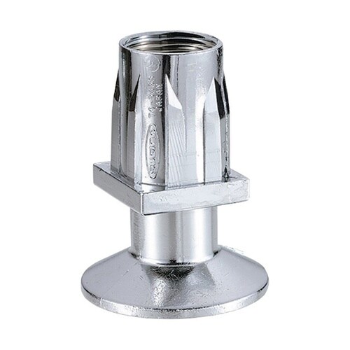 ゴムハンマーなどで角パイプに打ち込んで取付けます。アジャスター(中子)を回すことで高さの調整ができます。設置面は安定感のあるフランジ付きです。 |