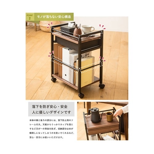 従来のワゴンラックの省スペースでコンパクトなデザインはそのままに、小物が収納できる引き出しが付くことでより細かな収納に対応。 |