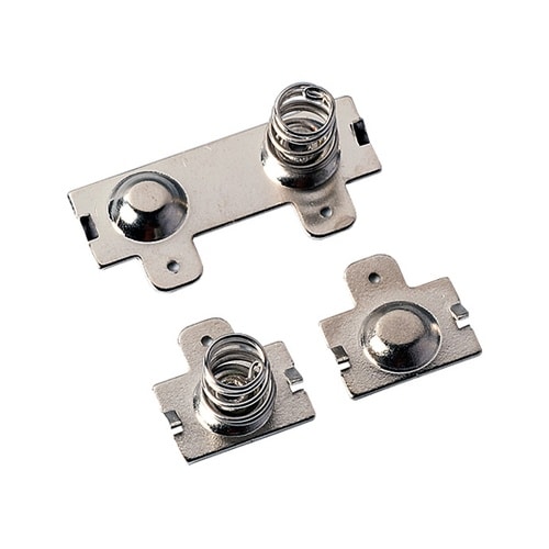 適合するプラスチックケースに乾電池を使用する場合、取り付ける金具です。マイナス面がばねになっており、プラスとマイナスの判別が容易になりました。はめ込み式のため、容易に取り付けできます。