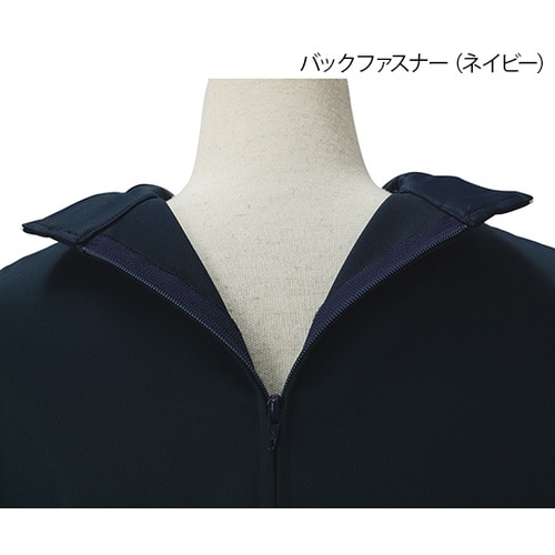髪型の崩れや襟周りの化粧移りを防止するために、脚を通して着用できる後ろファスナー仕様です。 |